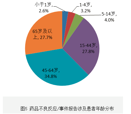 2018年藥品不良反應/事件報告中,男女患者比為0.86:1,女性略多于男性。14歲以下兒童患者的報告占9.8%;65歲以上老年患者的報告占27.7%(圖5)。