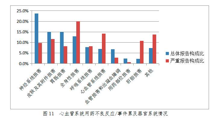 2018年心血管系統用藥不良反應/事件報告中,口服制劑累及器官系統排名前5位的是神經系統損害、胃腸損害、全身性損害、呼吸系統損害和皮膚及其附件損害;注射劑累及器官系統前5位是神經系統損害、皮膚及其附件損害、全身性損害、胃腸損害、血管損害和出凝血障礙(圖11)。